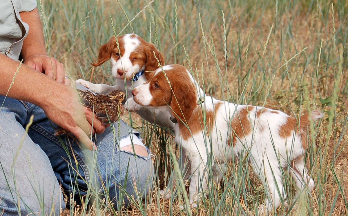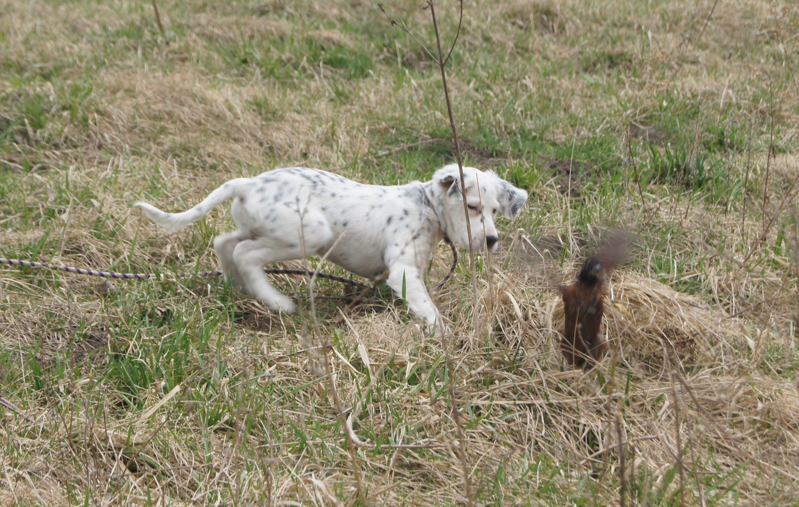 Como todo lo demás en el mundo de entrenar perros, hay una forma correcta y una incorrecta de exponer un cachorro a sus primeras aves. Mi setter más joven, Hanna, tuvo su primer pichón plantado exactamente a los 49 días de edad. Debido a que lo último que quieres es un ave aleteando y asustando un pequeño de 7 semanas, pon el ave en un calcetín (con un agujero para que saque la cabeza pero sus alas y patas queden inmóviles sin dañarlo). Luego pon el cachorro en la cuerda de adiestramiento y lleva el perro a remontar el viento para que use su nariz para descubrir el ave.