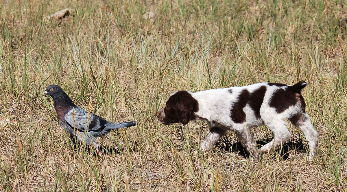 Ahora tengo dos perros en mi kennel. Ambos fueron expuestos a aves plantadas cuando eran pequeños. Annie, una Epagneul Bretón muy compacta, mostró las palomas desde el principio, a la edad de 10 o 12 semanas. June, una setter, no fue tan precoz. Cuando encontraba una paloma que le había plantado, la olía un poco y luego salía disparada en busca de una aventura que le interesara más.